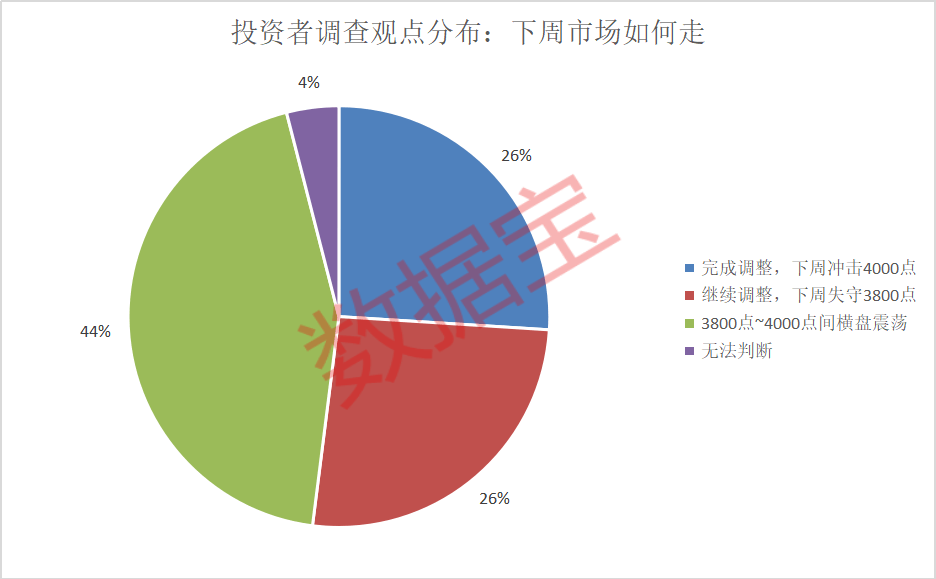 对于下周A股走势,受访者观点出现较大分歧。最为主流的是“3800点~4000点间横盘震荡”,占比达到44%;看涨与看跌的受访者占比基本持平,认为“完成调整,下周冲击4000点”与“继续调整,下周失守3800点”的声量相当,占比均为26%。