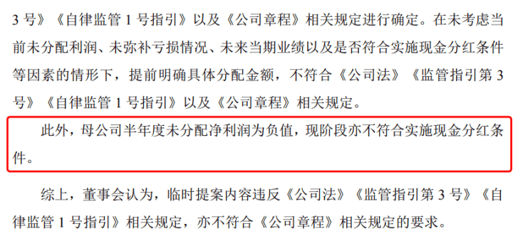 另外一个连几名股东都没有预料到的是,公司半年赚9亿,账上货币资金与交易性金融资产一共达到114亿元,公司未分配利润190亿元,却不符合派现条件,原因是母公司未分配利润为负。因此,喻荣虎等4名股东提出的《关于实施三季度报特别现金分红20亿的临时议案》被不予提交股东大会审议。